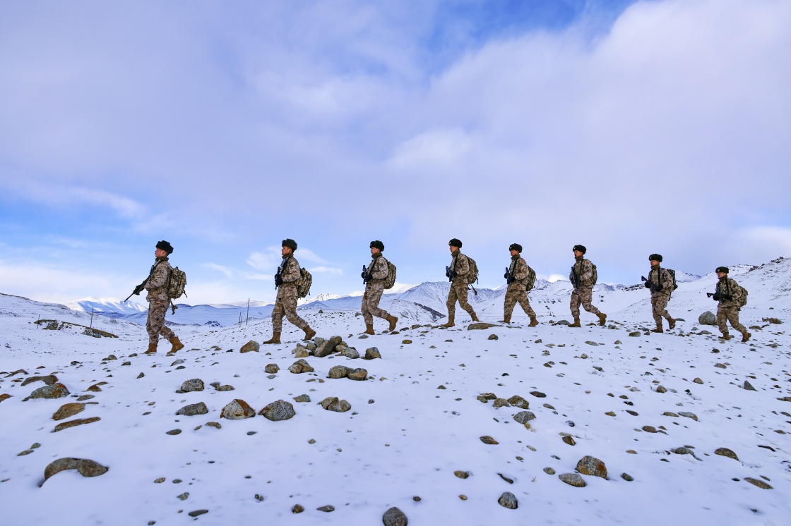 2024年2月9日,駐守帕米爾高原的新疆軍區某邊防團紅其拉甫邊防連官兵踏雪巡邏。新華社發(姬文志 攝)
